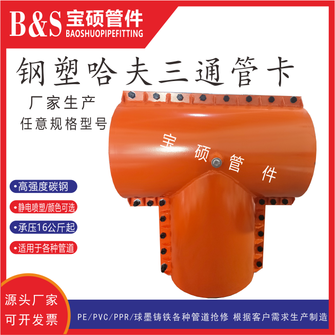 適用范圍用途:三通哈夫節用于管道的三通管部位發生砂眼、裂縫、斷裂的搶修。主要適用于鍍鋅管、鋼管、PE管、PVC管。