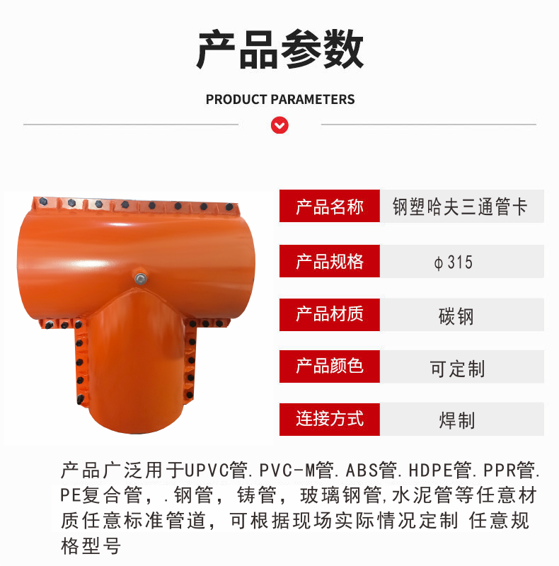 pe管道是目前用的最多的一種管道,pe管道的搶修也是大家比較關注的問題,如果是工程管道或者是居民管道漏水都會給用戶帶來很大的麻煩,有了pe管道專用堵漏器來搶修管道,管道堵漏器快速,便捷的搶修特點給用戶減少了損失,用于pe管道的堵漏器有pe直管堵漏器,pe三通堵漏器,pe異徑堵漏器,pe承口堵漏器,pe彎頭堵漏器等,以下主要介紹一下pe管三通堵漏器。