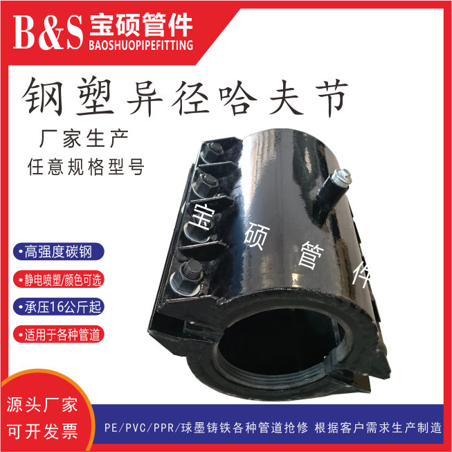 鋼塑異徑大小頭哈夫節的連接原理是利用兩塊帶有外齒的管板,通過擰緊螺栓使兩塊管板外側的突起部分與鋼管端部形成牢固的密封,從而實現了管道的連接。這種連接方式具有操作簡便、密封性能好等優點,同時適用于不同材質和規格的管道連接。