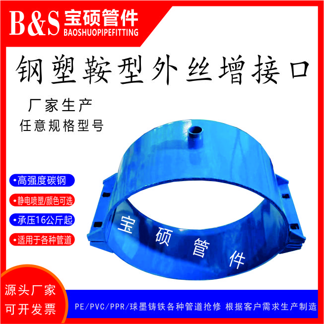 鋼塑鞍型外絲增接口哈夫節作為一種高效、可靠的管道搶修設備,在城市供水、礦井作業、石油、燃氣、化工、電力、海洋工程、鐵路運輸、供熱等行業和工業領域中發揮著重要作用。