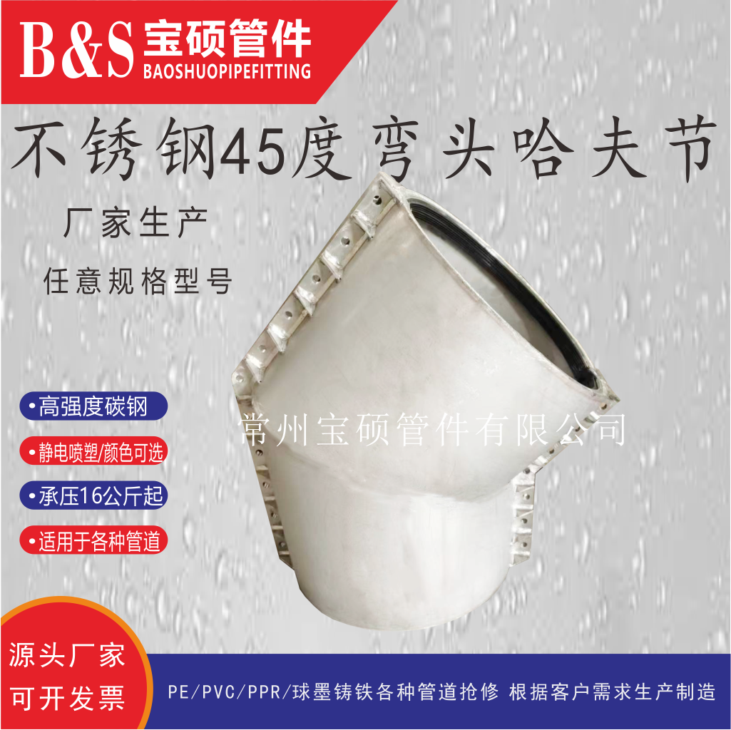 不銹鋼45°彎頭哈夫節的密封原理主要是依靠橡膠密封墊的彈性和塑形接觸密封技術。在安裝時,橡膠密封墊被緊固在主管上,隨著螺栓的擰緊,橡膠密封墊受到擠壓,產生彈性變形,從而緊密地貼合在管道表面,形成有效的密封。同時,由于橡膠密封墊具有一定的塑形,可以適應管道表面的微小不平整,進一步提高密封效果。在規定的管道工作壓力下,不銹鋼45°彎頭哈夫節的密封結構能夠承受介質的壓力,防止介質外泄,保證管道系統的正常運行。