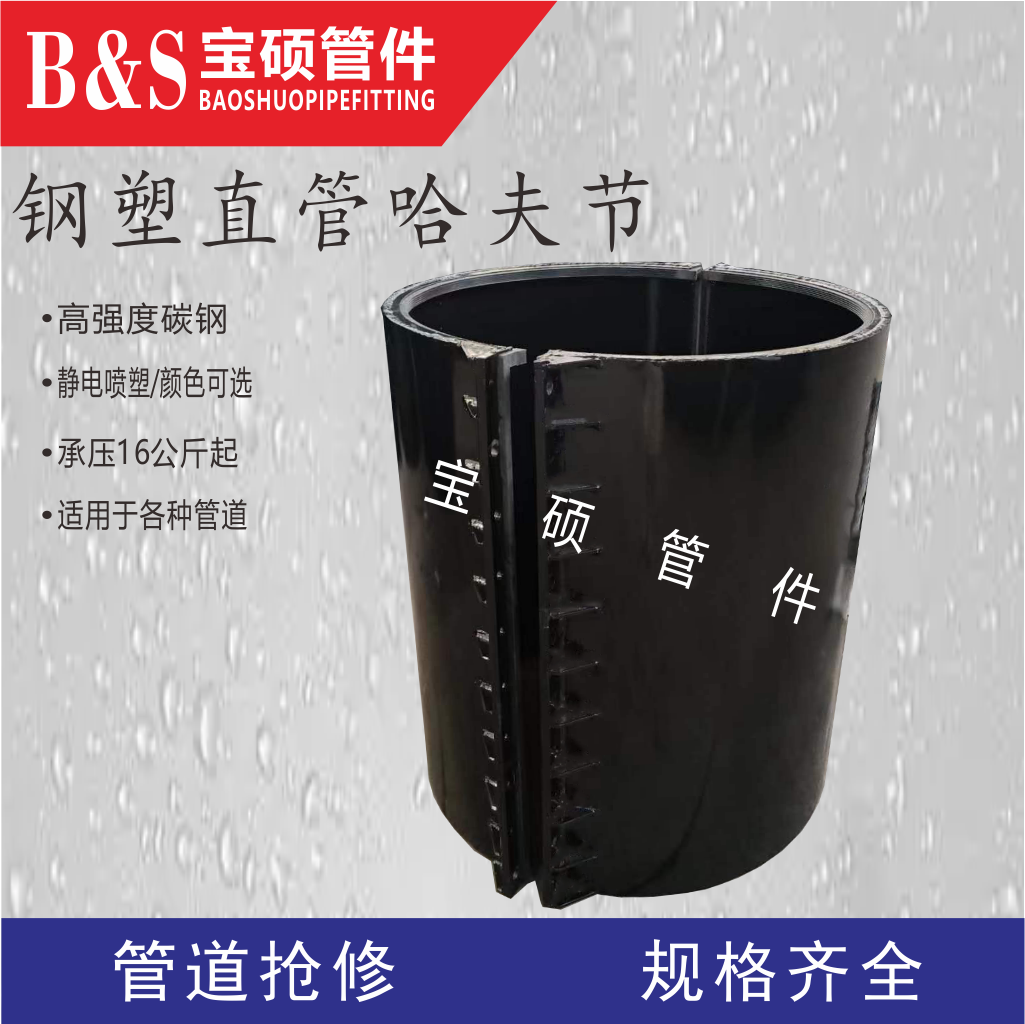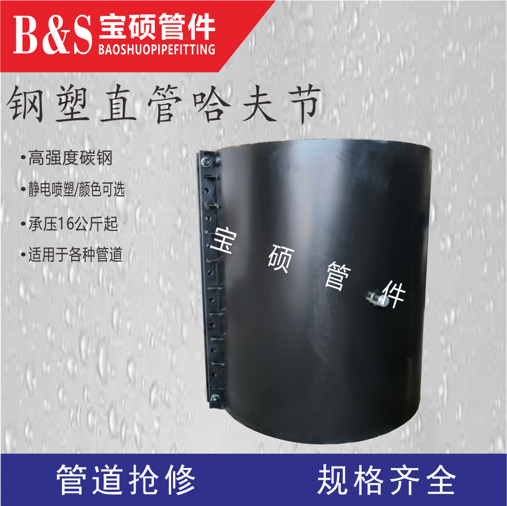 常州寶碩管件有限公司是一家專業生產各種管道哈夫節、三通哈夫節、彎頭哈夫節、異徑等管件哈夫節,以及高壓哈夫節、耐油哈夫節、耐高溫哈夫節、耐腐蝕哈夫節、碳鋼哈夫節、304.316.316L不銹鋼哈夫節的公司。此外,該公司還生產馬鞍三通管卡、四通管卡、哈夫三通管卡、鋼塑管件、柔性快速接口等產品。